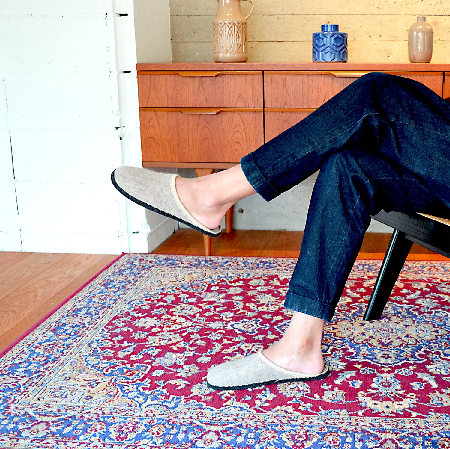 通気性の良いウールを使用しているので、春夏には素足で、寒い季節には靴下をプラスして1年中ご使用いただけます